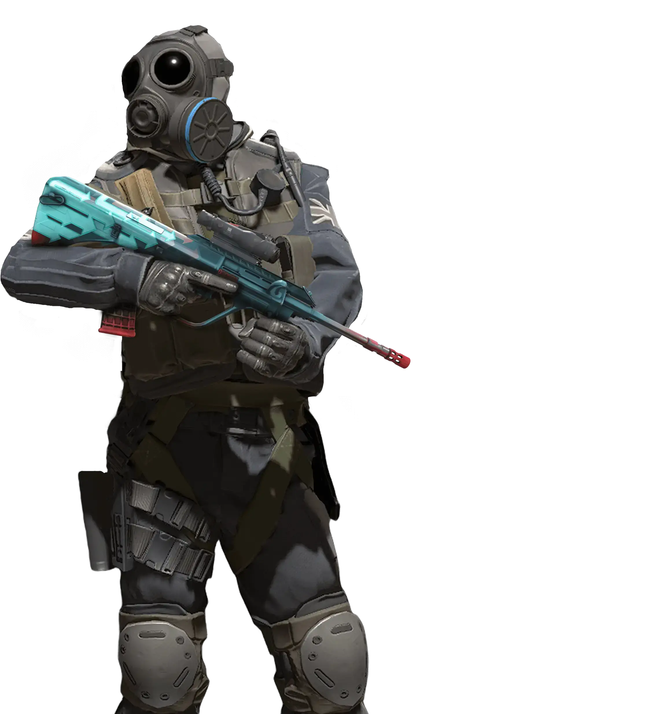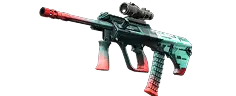 The powerful and accurate AUG rifle with an optical sight compensates for its long reload time with low bullet spread and high rate of fire. The body is decorated with bright colors and a pattern of many arrows pointing forward.