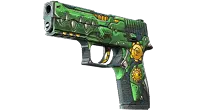 The P250 pistol is a firearm with a high rate of fire and low recoil, making it a relatively inexpensive choice against armored opponents. It features a green metallic crocodile design with yellow accents.